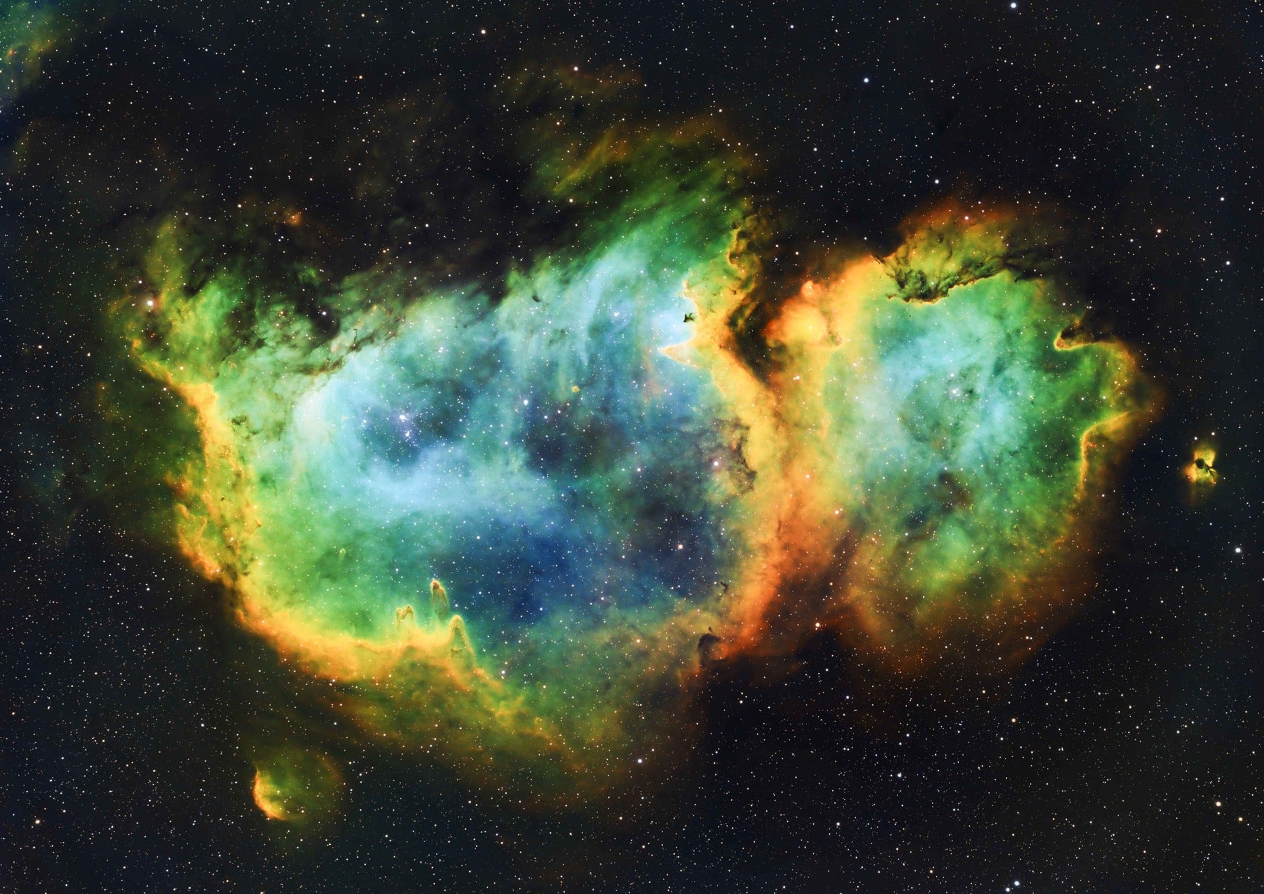The Soul Nebula, also known as IC 1848, is a large emission nebula located in the constellation Cassiopeia, about 7,500 light-years away from Earth. The nebula gets its name from its location near the neighboring Heart Nebula, with which it is often imaged together. The Soul Nebula is a site of ongoing star formation, with new stars being born within its clouds of gas and dust. The nebula is ionized by the radiation from nearby young, hot stars, producing its distinctive pinkish glow. The Soul Nebula is a popular target for astrophotographers due to its striking appearance and its proximity to other well-known objects in the Cassiopeia constellation, such as the bright star Schedar.